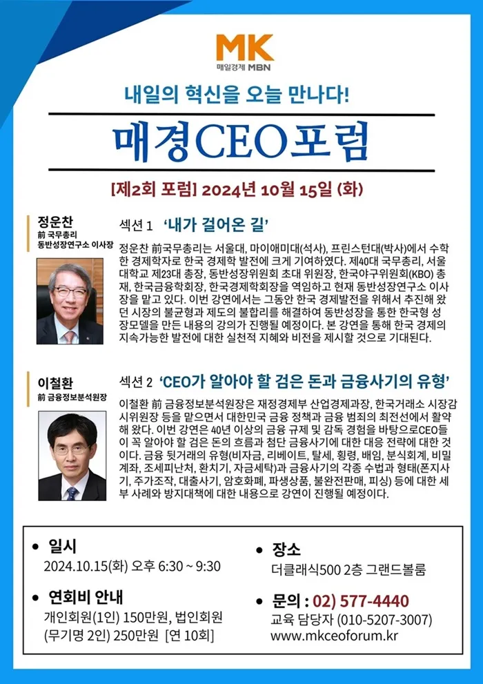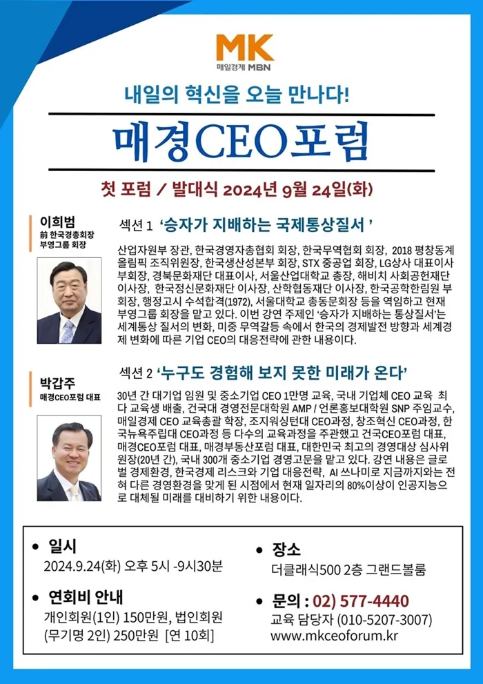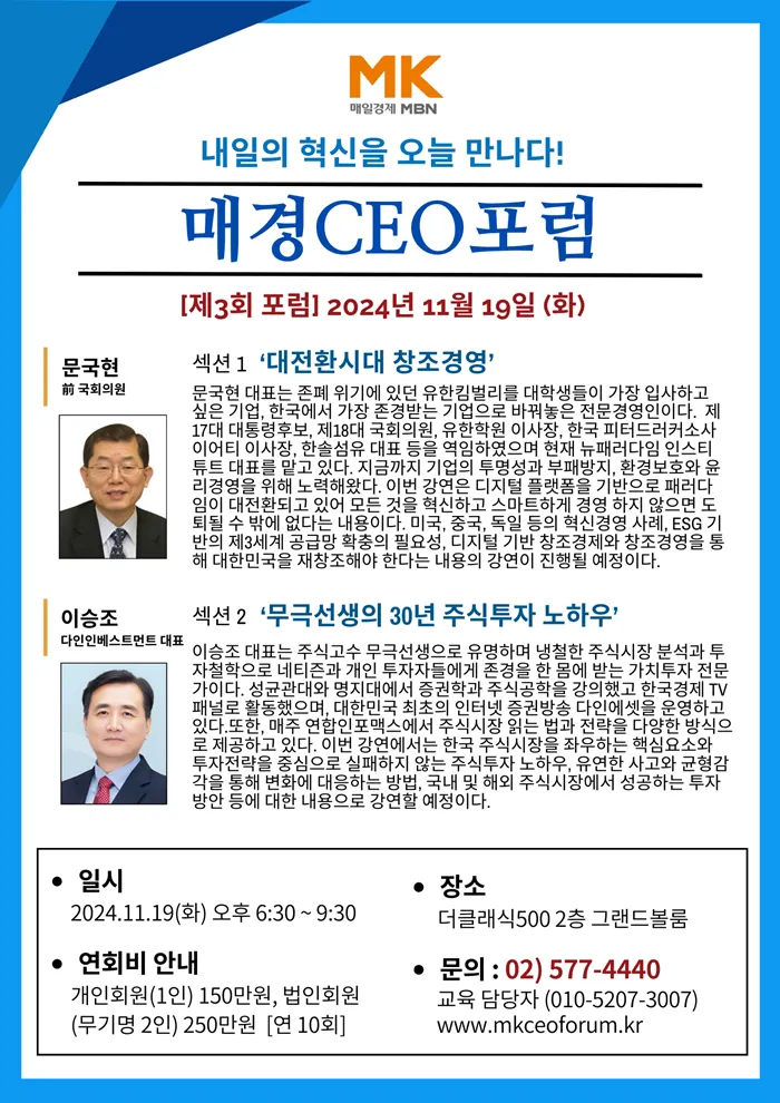 문국현 前 국회의원이 매경 CEO 포럼 제3회 강연에서 대전환 시대를 맞아 창조경영의 중요성을 강조했다. 그는 과거의 성공을 넘어 혁신적 사고와 지속적 학습을 통해 조직과 사회의 변화를 이끌어내는 창조경영의 필요성을 설파했다.